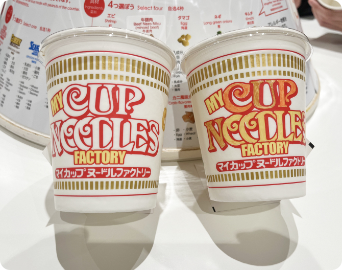 百福さんの偉大さを改めて実感しました。90代になってもなお新しいものを生み出そうと開発を続けていたと知り、本当に「すごい」という言葉しか出てきません。この世にまだないものを形にし、人の生活を変えてしまうような発明をする人は、やはり偉大だなと感じました。カップヌードルファクトリーも想像以上に人が多く、とても賑わっていて、その人気ぶりからも多くの人に愛され続けている体験なんだなと伝わってきました。