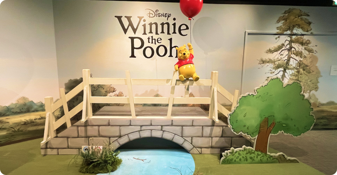 1920年代のイギリスの雰囲気を再現した空間の中で、原作の挿絵や資料をはじめ、ディズニー・アニメーションのコンセプトアートや原画、背景画などが展示されます。100エーカーの森をイメージした没入型の演出やフォトスポットも登場し、世代を超えて愛され続けるプーさんの世界観を体感できる内容となっています。